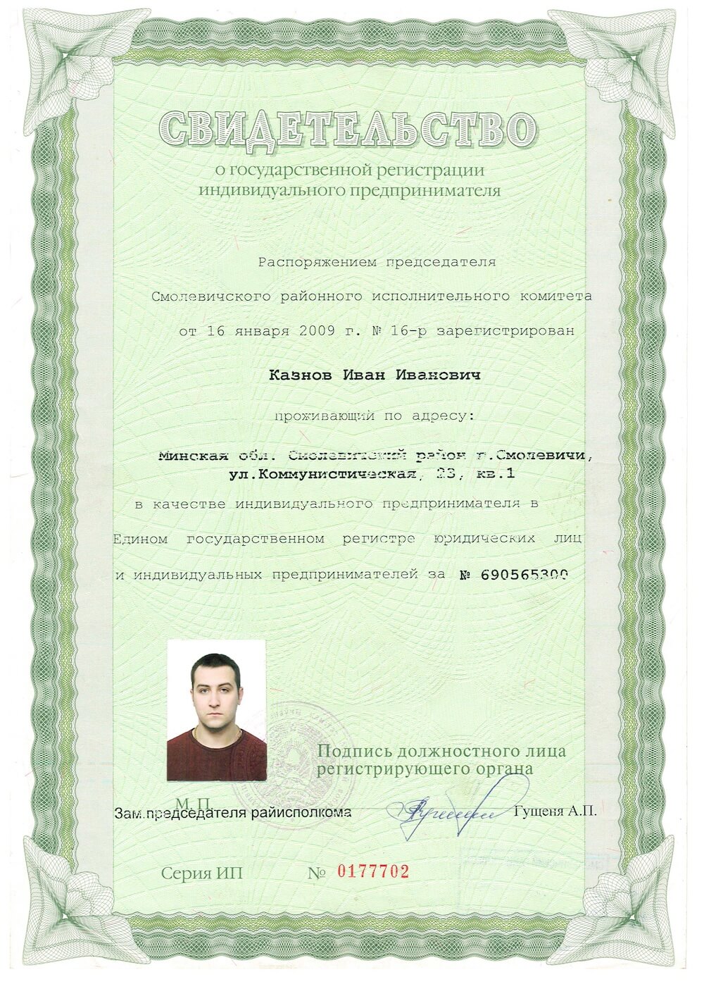 Юридический адрес: | Республика Беларусь, 222201, Минская область, г. Смолевичи, ул. Коммунистическая, д. 23, кв. 1 |